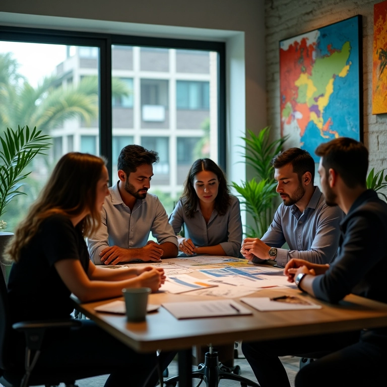 Equipe diversa equilibrando ícones financeiros em escritório moderno.