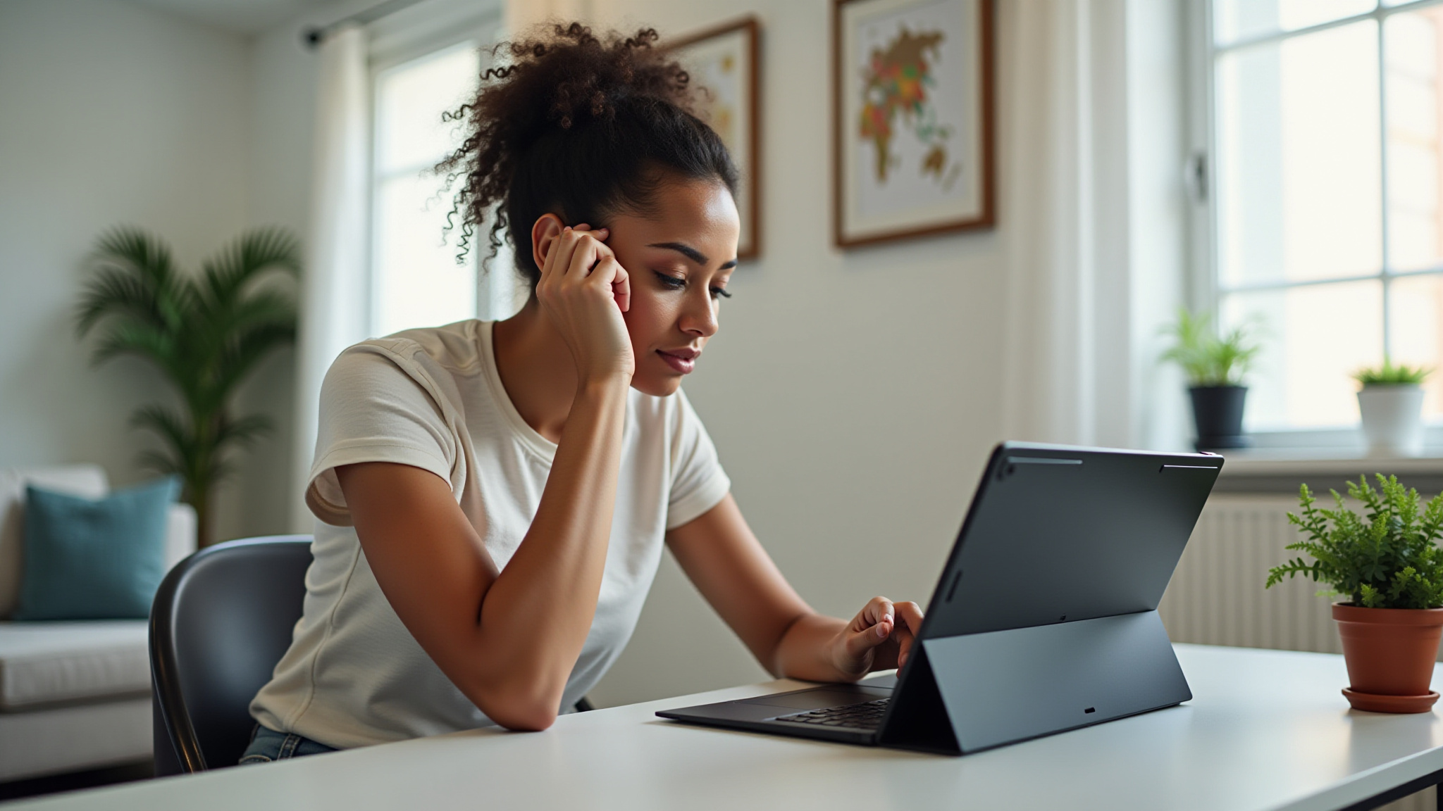Jovem fazendo teste vocacional online em um tablet, em um apartamento moderno e bem iluminado.